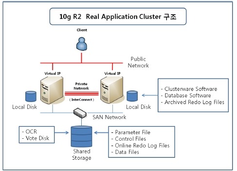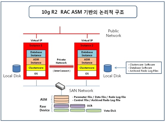 ASM 방식의 적용 : 9i 까지는 RAW device를 이용해서 storage를 구성하였으나 10g 부터는 ASM (Automatic Storage Management) 방식으로 storage를 구성한다.