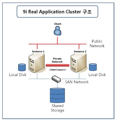 interconnet (Private network): OPS는 데이터를 받아올때 반드시 Storage를 이용해야 한다. RAC 9i 부터는 interconnet 기능을 이용하여 인스턴스간에 데이터를 직접적으로 주고 받을수 있게 된다.