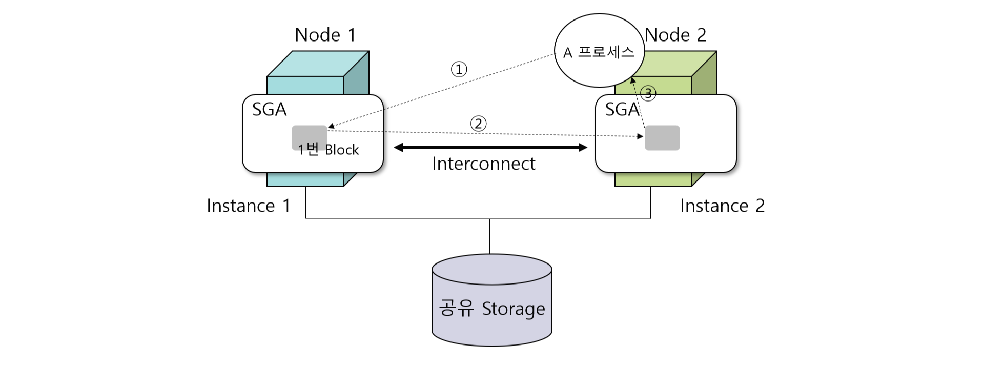 ③ Interconnect를 이용하여 Instance 2로 캐싱된 1번 Block을 A 프로세스가 액세스할 수 있게 된다.