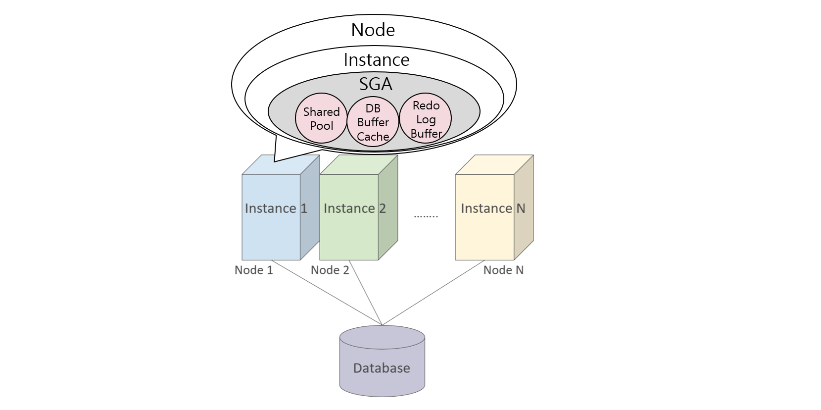 하나의 DB에 연결된 서버를 의미한다. 2 Node RAC는 2대의 물리적인 서버가 하나의 DB에 연결된 경우이다.
