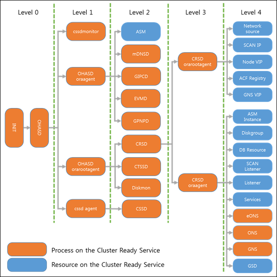 - 다음의 명령어로 OHASD process가 기동되면서 Oracle Clusterware 의해 관리되는 프로세스와 리소스를 시작할 수 있다.