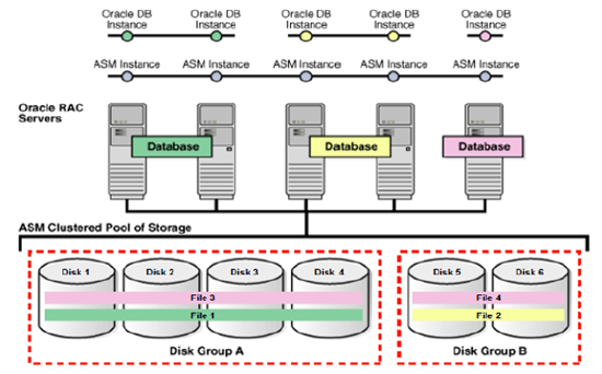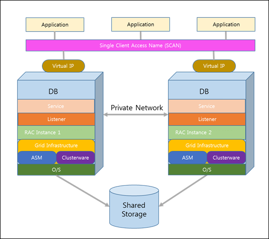 - Oracle RAC에서는 Oracle Database (데이터를 실제로 보유하고 있는 Storage의 물리적 구조 즉, 데이터 파일들에서 Oracle Instance (데이터 접근 지원을 위해 서버 상에서 실행되는 프로세스 및 메모리 구조)를 분리할 수 있다.